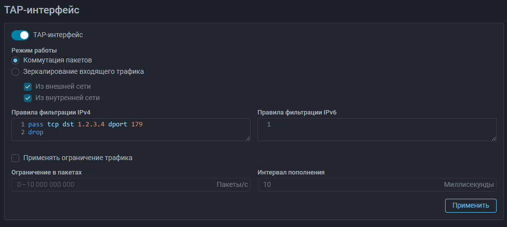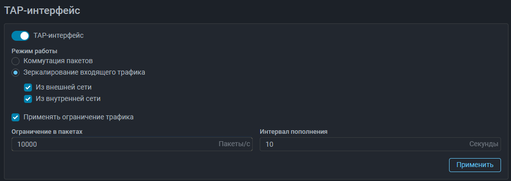 Добавлен режим работы, при котором входящий трафик из внешней и внутренней сети может зеркалироваться на TAP-интерфейс.