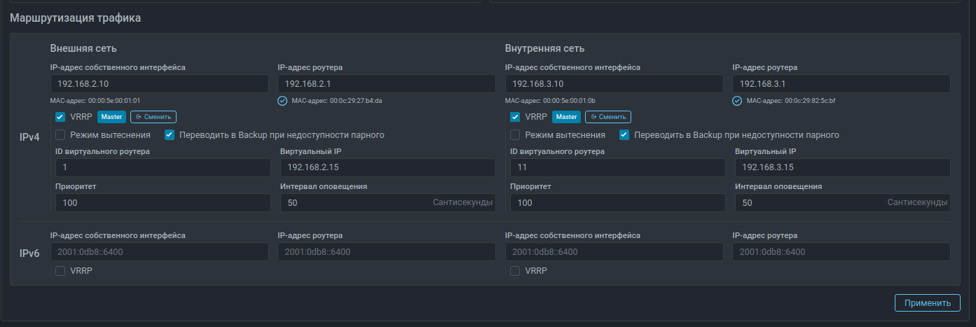 Теперь можно принудительно отдать статус VRRP-мастера. Новый мастер выбирается согласно заданным значениям приоритета.